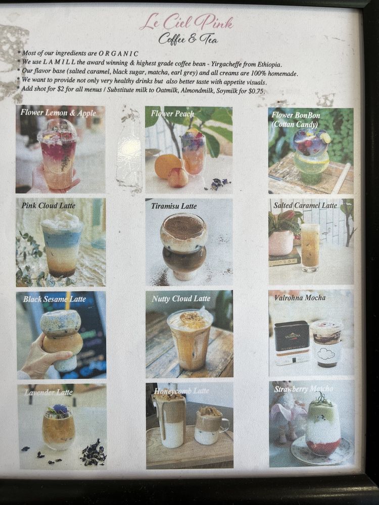 Le Ciel Pink is a unique gourmet cafe located in West Hollywood, offering a range of signature beverages and pastries. The Signature Coffee menu features enticing options like the Black Sesame Cream Latte and the Pink Cloud Latte, each crafted with care and creativity. The bakery selection includes a must-try Croiffle, a delightful hybrid of a croissant and Belgian waffle. The Signature Flower Ade and Tea options feature inventive combinations like the Flower Bonbon with Muscat grape base and edible flower ice cubes. The ambiance at Le Ciel Pink is charming and inviting, with options for outdoor seating. Overall, Le Ciel Pink stands out for its innovative creations and attention to detail, making it a must-visit spot for food and drink enthusiasts in the area.
